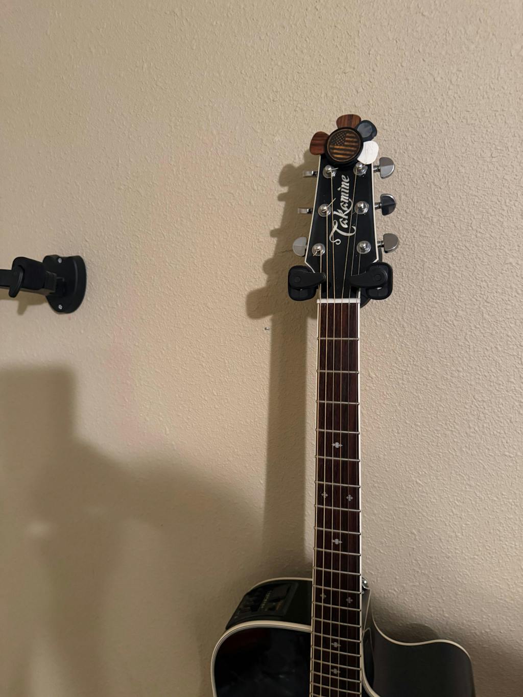 I have a Gibson J200 and the inlay design makes it blend much nicer with my guitar than other pick holders. It sits on the top and stores my picks for ease of access.