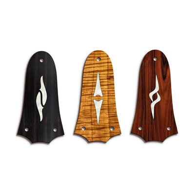 All of our Truss Rod Covers consist of a finished top layer (Black Ebony, Rosewood, or AAA Curly Koa) with two base layers of Rosewood.  We use this layered construction on a base of Rosewood for enhanced durability.