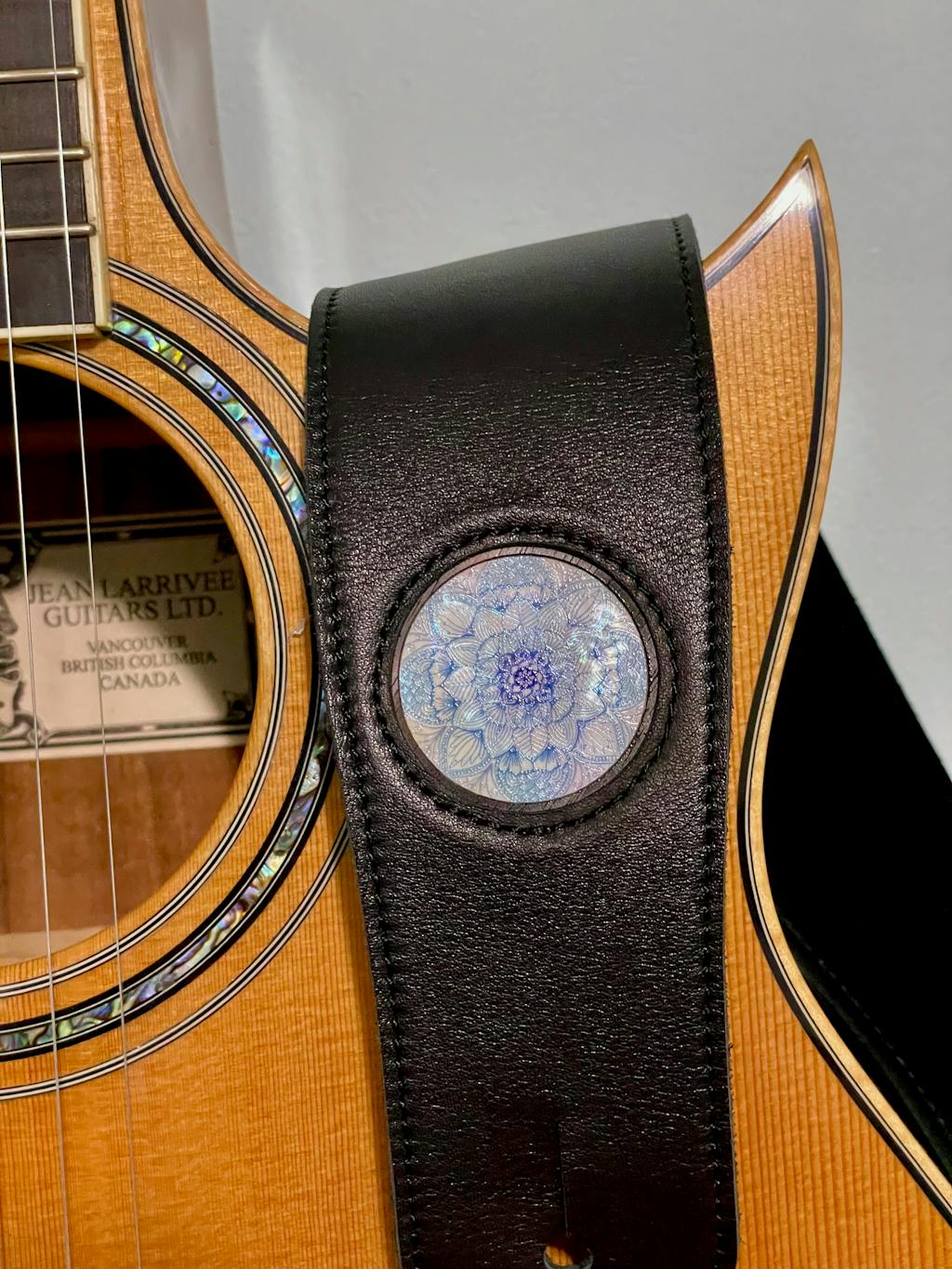 I was TRULY impressed with the beautiful supple leather of this strap. Buttery soft and the delicate iridescent Mandala Inlay is enchanting! You will NOT be disappointed with this beautiful work of art!